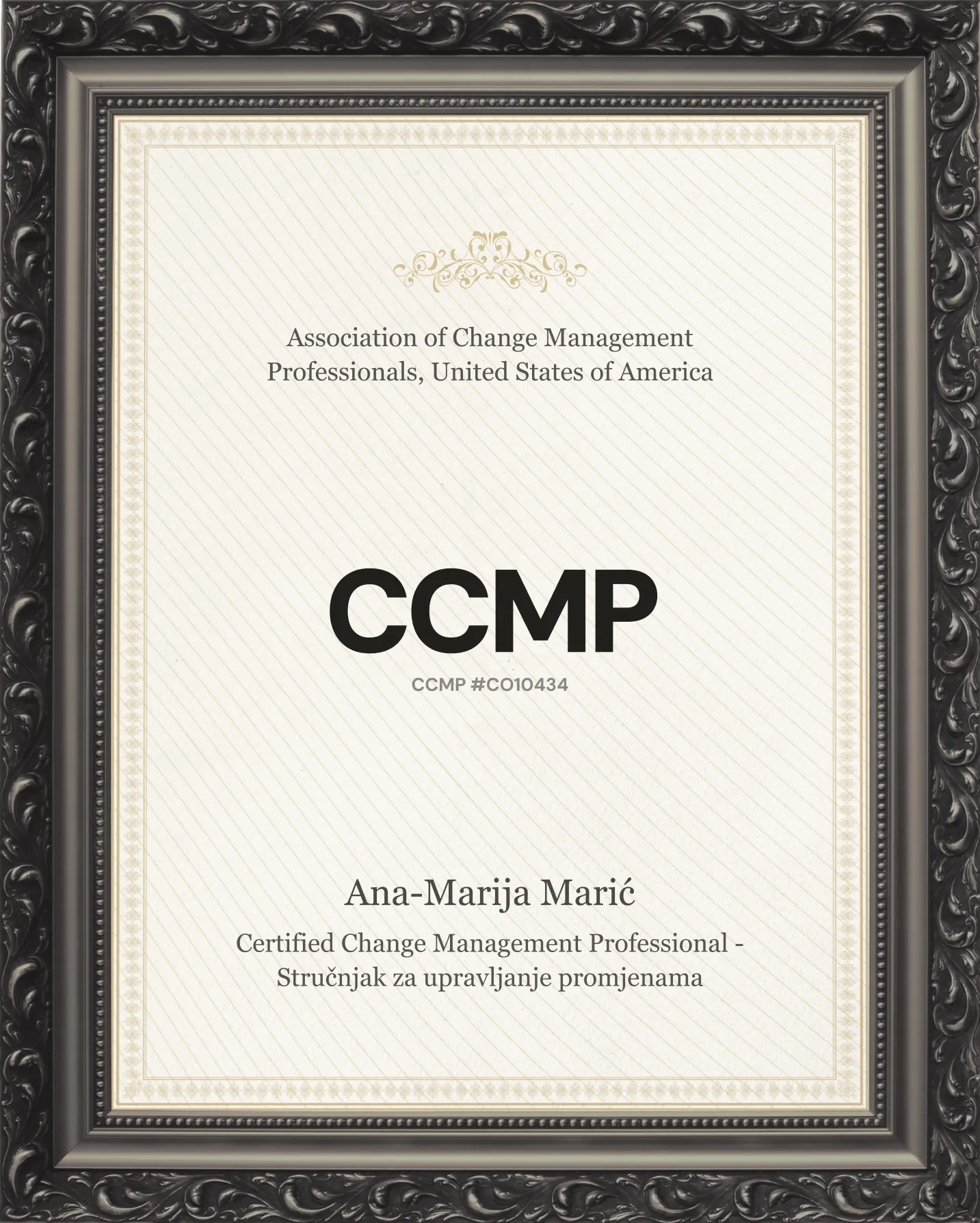 Certified Change Management Professional (CCMP) je globalni standard za upravljanje promjenama. Dobiva se nakon uspješno položenog ispita znanja i provjere iskustva u radu s promjenama, a obnavlja se svake tri godine. Prva sam u Hrvatskoj i regiji koja je stekla taj certifikat, 2022. godine. Taj certifikat, u kombinaciji s mojim ostalim kvalifikacijama i 25 godina profesionalnog iskustva, predstavlja jamstvo da birate stručnu i dokazanu podršku na putu prema željenom ishodu.